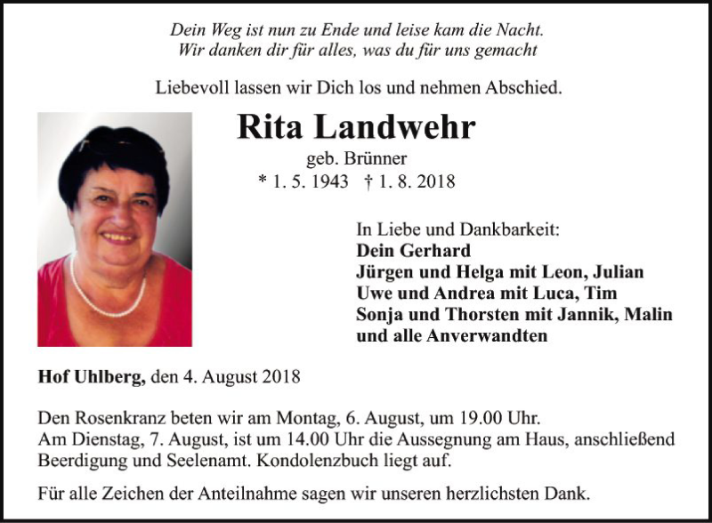 Hier finden Sie alle Traueranzeigen aus der Zeitung, die bisher für Rita Landwehr erschienen sind. Weitere Traueranzeigen, die in der Zeitung erscheinen, werden hier ebenfalls aufgelistet
