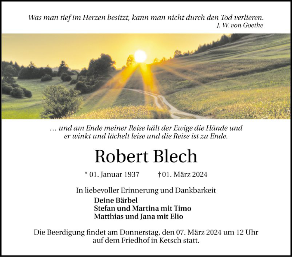 Hier finden Sie alle Traueranzeigen aus der Zeitung, die bisher für Robert Blech erschienen sind. Weitere Traueranzeigen, die in der Zeitung erscheinen, werden hier ebenfalls aufgelistet
