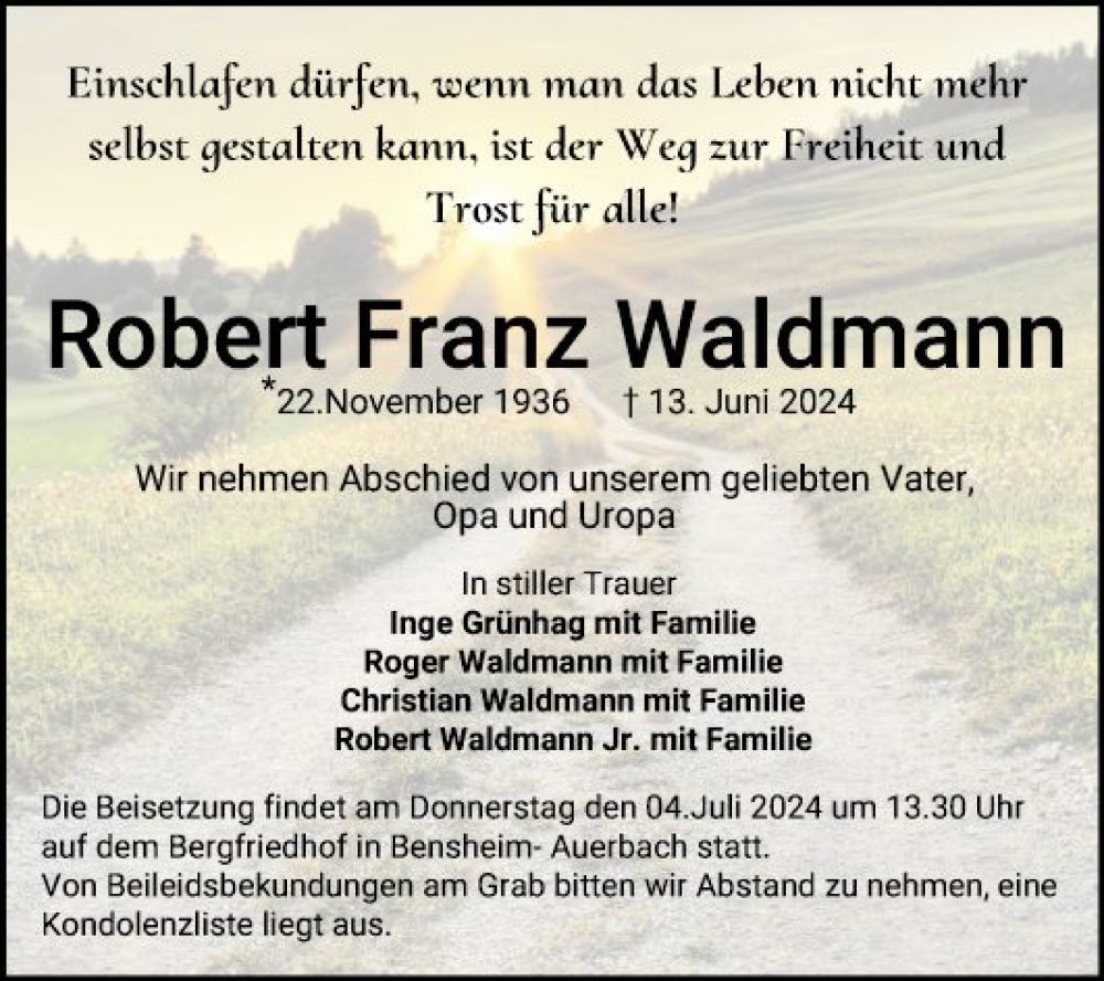 Hier finden Sie alle Traueranzeigen aus der Zeitung, die bisher für Robert Franz Waldmann erschienen sind. Weitere Traueranzeigen, die in der Zeitung erscheinen, werden hier ebenfalls aufgelistet