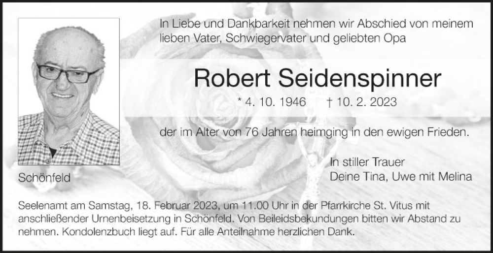 Hier finden Sie alle Traueranzeigen aus der Zeitung, die bisher für Robert Seidenspinner erschienen sind. Weitere Traueranzeigen, die in der Zeitung erscheinen, werden hier ebenfalls aufgelistet