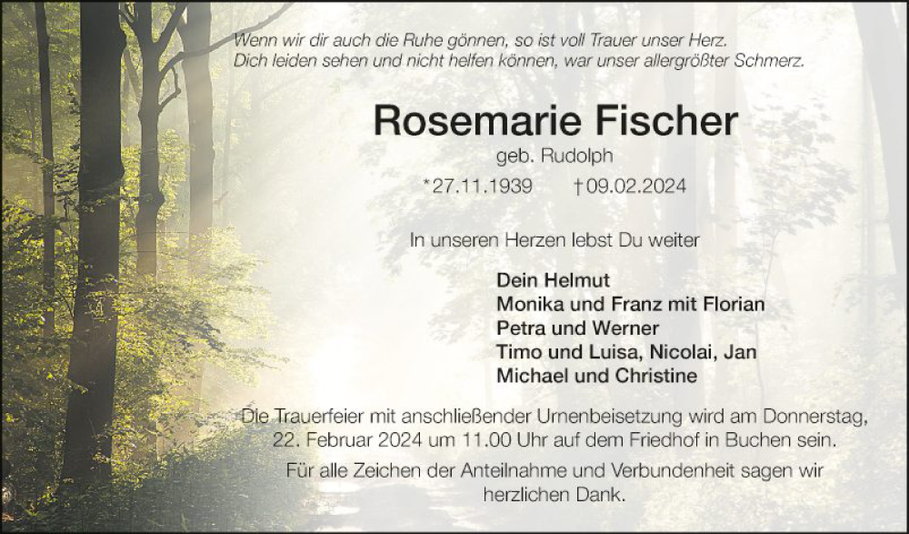Hier finden Sie alle Traueranzeigen aus der Zeitung, die bisher für Rosemarie Fischer erschienen sind. Weitere Traueranzeigen, die in der Zeitung erscheinen, werden hier ebenfalls aufgelistet