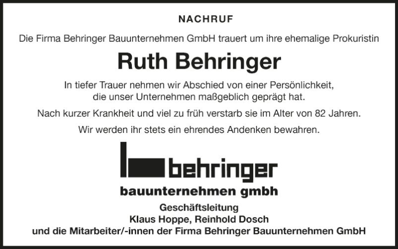 Hier finden Sie alle Traueranzeigen aus der Zeitung, die bisher für Ruth Behringer erschienen sind. Weitere Traueranzeigen, die in der Zeitung erscheinen, werden hier ebenfalls aufgelistet