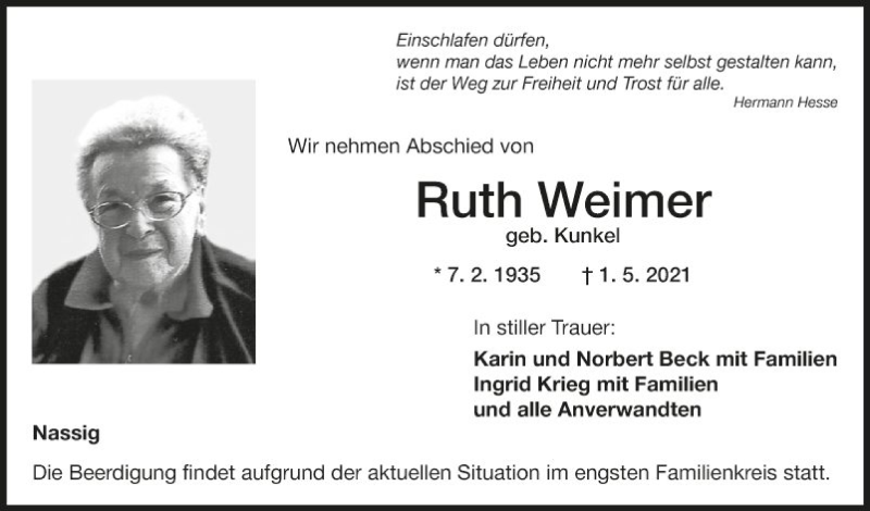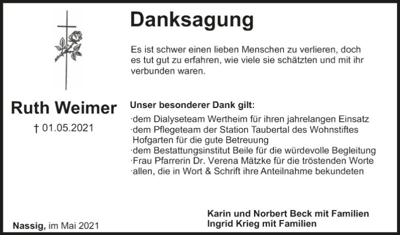 Hier finden Sie alle Traueranzeigen aus der Zeitung, die bisher für Ruth Weimer erschienen sind. Weitere Traueranzeigen, die in der Zeitung erscheinen, werden hier ebenfalls aufgelistet