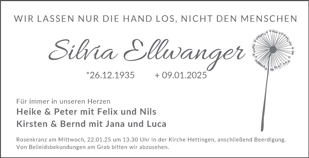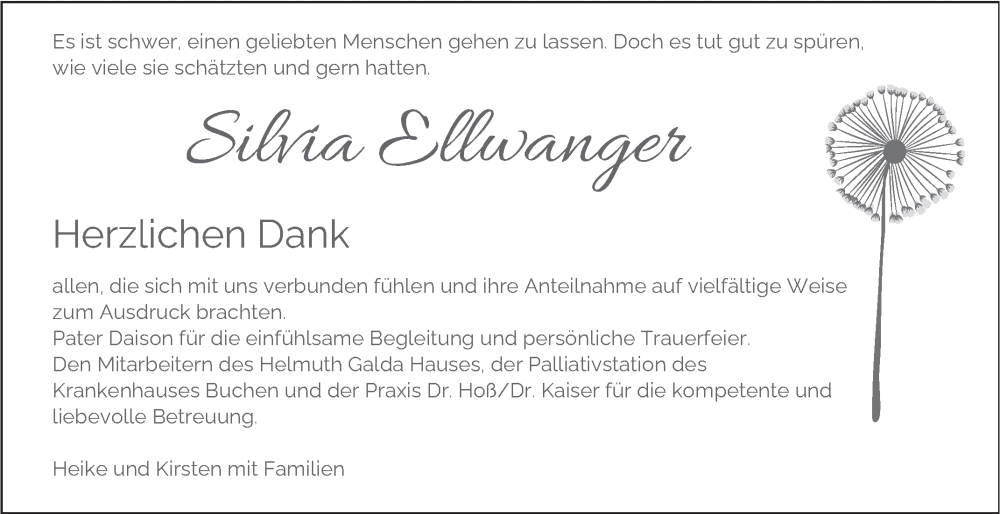Hier finden Sie alle Traueranzeigen aus der Zeitung, die bisher für Silvia Ellwanger erschienen sind. Weitere Traueranzeigen, die in der Zeitung erscheinen, werden hier ebenfalls aufgelistet