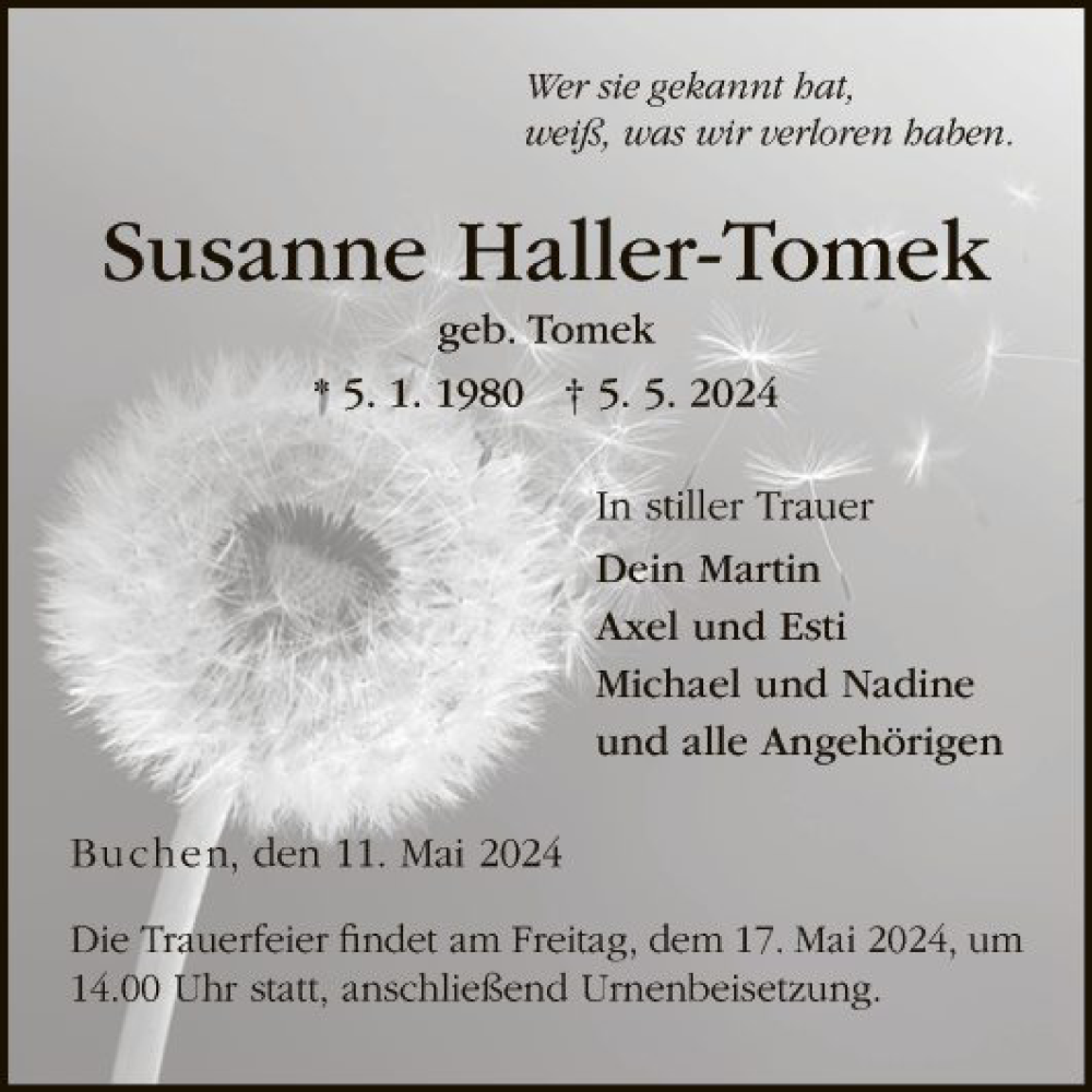 Hier finden Sie alle Traueranzeigen aus der Zeitung, die bisher für Susanne Haller-Tomek erschienen sind. Weitere Traueranzeigen, die in der Zeitung erscheinen, werden hier ebenfalls aufgelistet