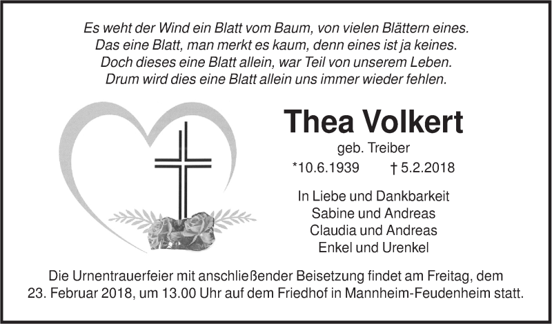 Hier finden Sie alle Traueranzeigen aus der Zeitung, die bisher für Thea Volkert erschienen sind. Weitere Traueranzeigen, die in der Zeitung erscheinen, werden hier ebenfalls aufgelistet