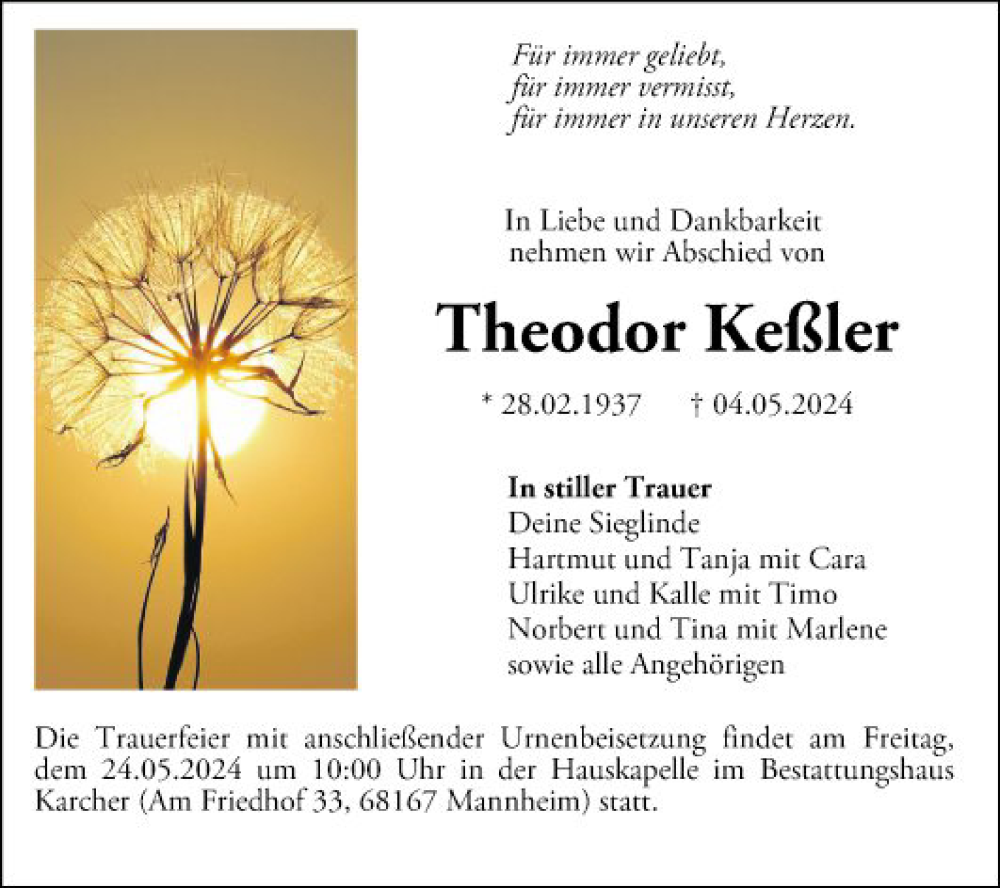 Hier finden Sie alle Traueranzeigen aus der Zeitung, die bisher für Theodor Keßler erschienen sind. Weitere Traueranzeigen, die in der Zeitung erscheinen, werden hier ebenfalls aufgelistet