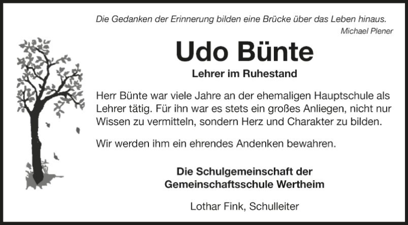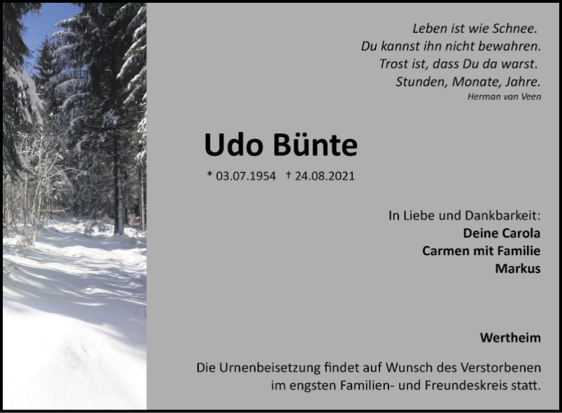 Hier finden Sie alle Traueranzeigen aus der Zeitung, die bisher für Udo Bünte erschienen sind. Weitere Traueranzeigen, die in der Zeitung erscheinen, werden hier ebenfalls aufgelistet