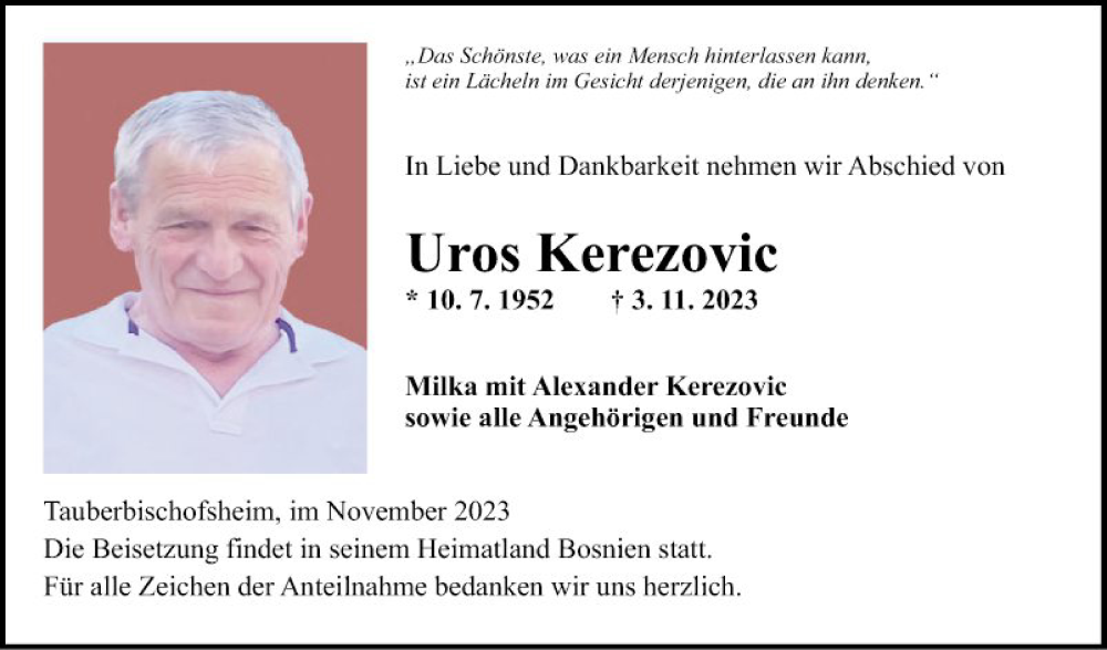 Hier finden Sie alle Traueranzeigen aus der Zeitung, die bisher für Uros Kerezovic erschienen sind. Weitere Traueranzeigen, die in der Zeitung erscheinen, werden hier ebenfalls aufgelistet