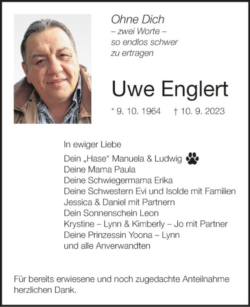 Hier finden Sie alle Traueranzeigen aus der Zeitung, die bisher für Uwe Englert erschienen sind. Weitere Traueranzeigen, die in der Zeitung erscheinen, werden hier ebenfalls aufgelistet