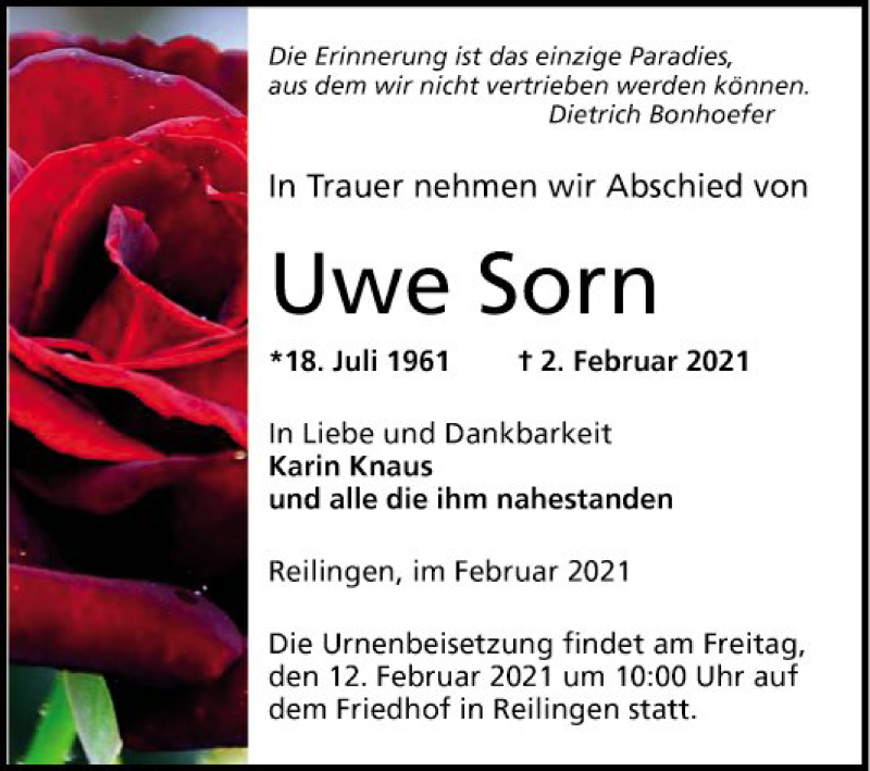 Hier finden Sie alle Traueranzeigen aus der Zeitung, die bisher für Uwe Sorn erschienen sind. Weitere Traueranzeigen, die in der Zeitung erscheinen, werden hier ebenfalls aufgelistet