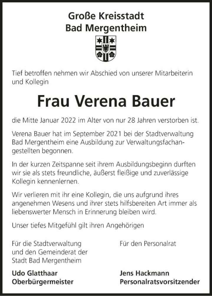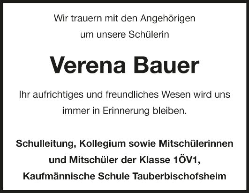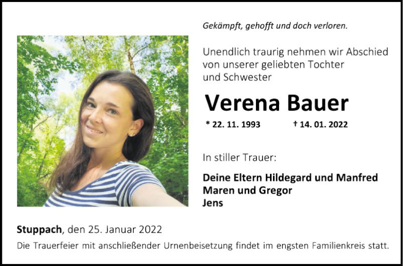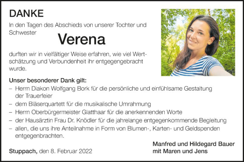 Hier finden Sie alle Traueranzeigen aus der Zeitung, die bisher für Verena Bauer erschienen sind. Weitere Traueranzeigen, die in der Zeitung erscheinen, werden hier ebenfalls aufgelistet