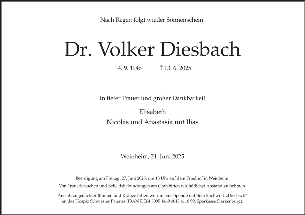 Hier finden Sie alle Traueranzeigen aus der Zeitung, die bisher für Volker Diesbach erschienen sind. Weitere Traueranzeigen, die in der Zeitung erscheinen, werden hier ebenfalls aufgelistet