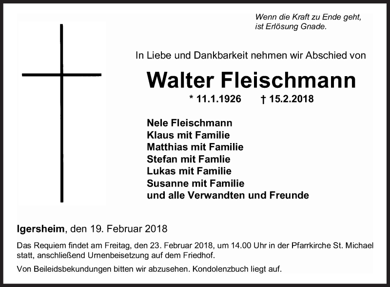 Hier finden Sie alle Traueranzeigen aus der Zeitung, die bisher für Walter Fleischmann erschienen sind. Weitere Traueranzeigen, die in der Zeitung erscheinen, werden hier ebenfalls aufgelistet