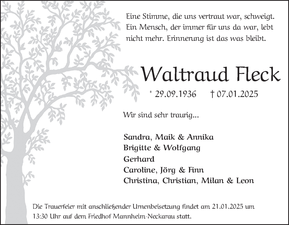 Hier finden Sie alle Traueranzeigen aus der Zeitung, die bisher für Waltraud Fleck erschienen sind. Weitere Traueranzeigen, die in der Zeitung erscheinen, werden hier ebenfalls aufgelistet