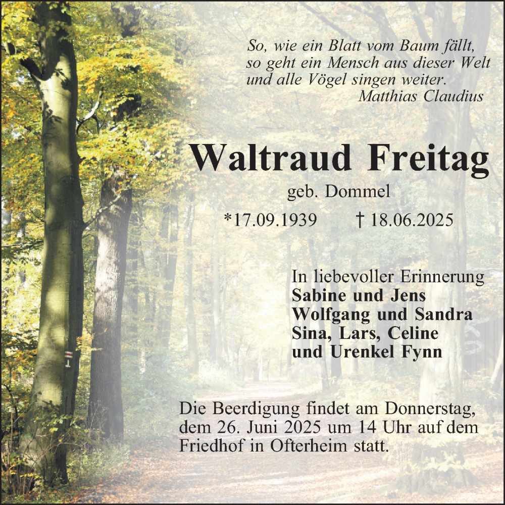 Hier finden Sie alle Traueranzeigen aus der Zeitung, die bisher für Waltraud Freitag erschienen sind. Weitere Traueranzeigen, die in der Zeitung erscheinen, werden hier ebenfalls aufgelistet