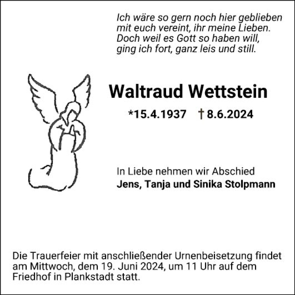 Hier finden Sie alle Traueranzeigen aus der Zeitung, die bisher für Waltraud Wettstein erschienen sind. Weitere Traueranzeigen, die in der Zeitung erscheinen, werden hier ebenfalls aufgelistet