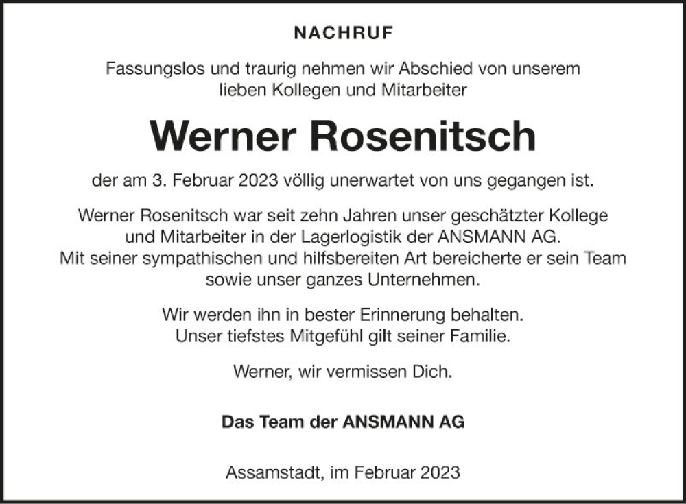 Hier finden Sie alle Traueranzeigen aus der Zeitung, die bisher für Werner Rosenitsch erschienen sind. Weitere Traueranzeigen, die in der Zeitung erscheinen, werden hier ebenfalls aufgelistet