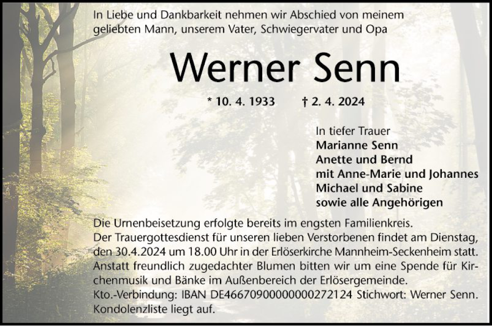 Hier finden Sie alle Traueranzeigen aus der Zeitung, die bisher für Werner Senn erschienen sind. Weitere Traueranzeigen, die in der Zeitung erscheinen, werden hier ebenfalls aufgelistet