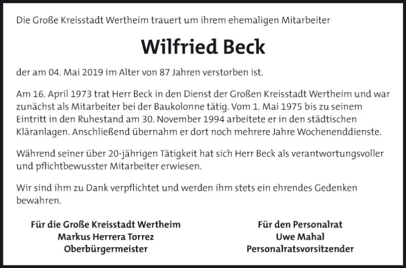 Hier finden Sie alle Traueranzeigen aus der Zeitung, die bisher für Wilfried Beck erschienen sind. Weitere Traueranzeigen, die in der Zeitung erscheinen, werden hier ebenfalls aufgelistet