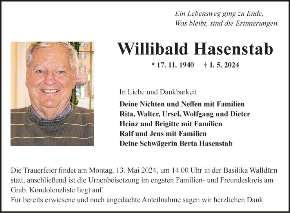 Hier finden Sie alle Traueranzeigen aus der Zeitung, die bisher für Willibald Hasenstab erschienen sind. Weitere Traueranzeigen, die in der Zeitung erscheinen, werden hier ebenfalls aufgelistet