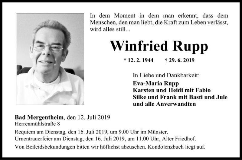 Hier finden Sie alle Traueranzeigen aus der Zeitung, die bisher für Winfried Rupp erschienen sind. Weitere Traueranzeigen, die in der Zeitung erscheinen, werden hier ebenfalls aufgelistet