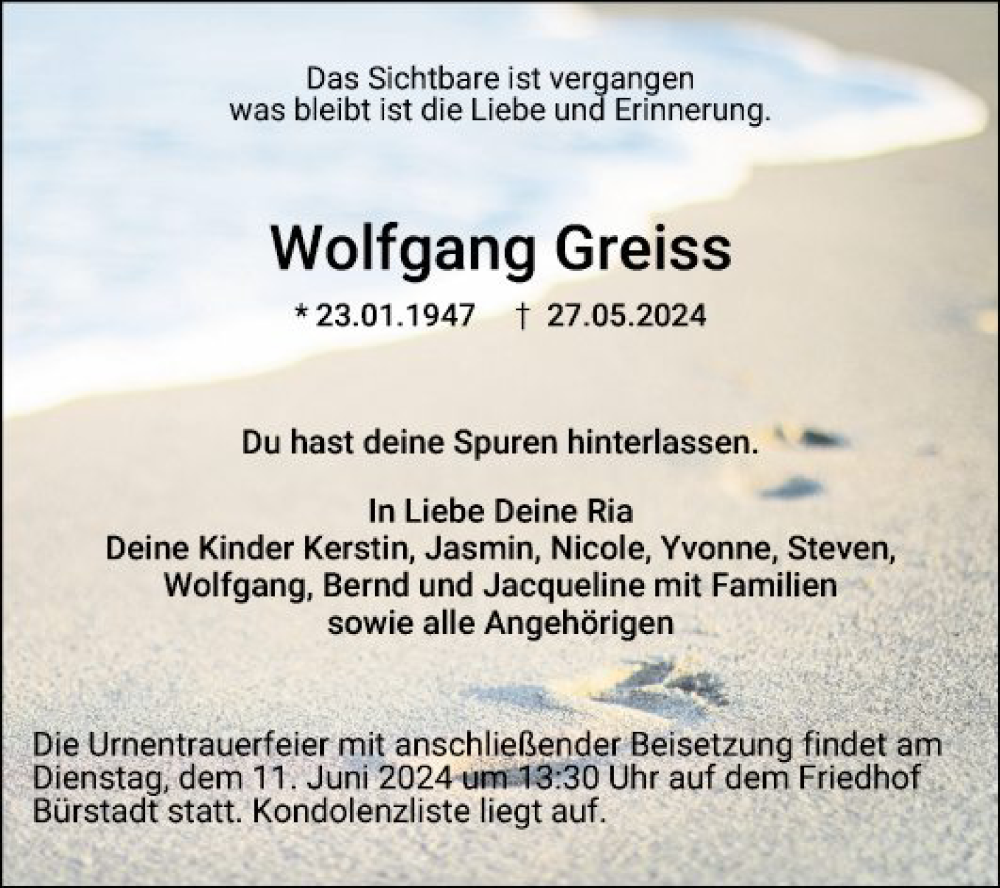 Hier finden Sie alle Traueranzeigen aus der Zeitung, die bisher für Wolfgang Greiss erschienen sind. Weitere Traueranzeigen, die in der Zeitung erscheinen, werden hier ebenfalls aufgelistet