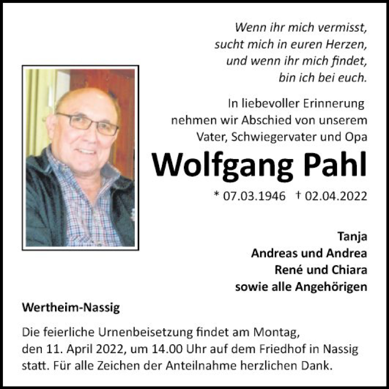 Hier finden Sie alle Traueranzeigen aus der Zeitung, die bisher für Wolfgang Pahl erschienen sind. Weitere Traueranzeigen, die in der Zeitung erscheinen, werden hier ebenfalls aufgelistet