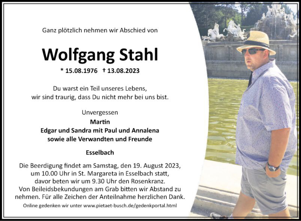 Hier finden Sie alle Traueranzeigen aus der Zeitung, die bisher für Wolfgang Stahl erschienen sind. Weitere Traueranzeigen, die in der Zeitung erscheinen, werden hier ebenfalls aufgelistet