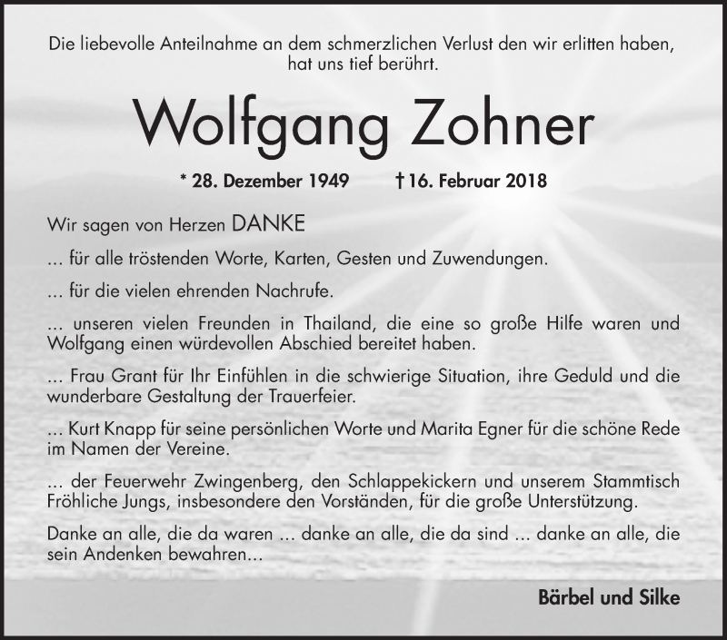 Hier finden Sie alle Traueranzeigen aus der Zeitung, die bisher für Wolfgang Zohner erschienen sind. Weitere Traueranzeigen, die in der Zeitung erscheinen, werden hier ebenfalls aufgelistet